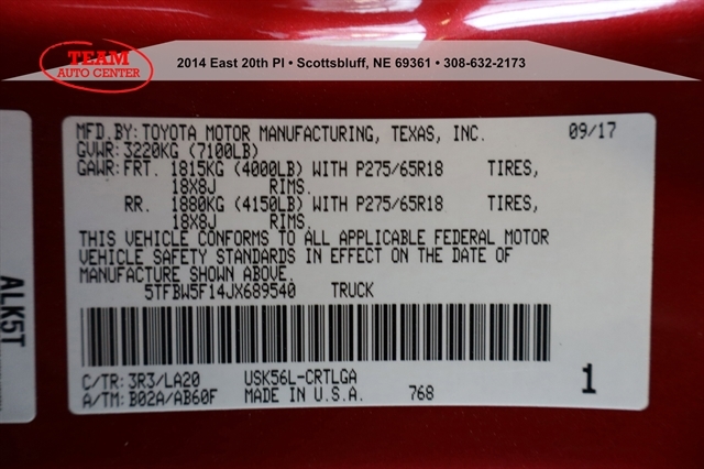 | VIN | 5TFBW5F14JX689540 |