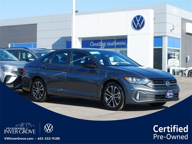Certified. APPLE CAR PLAY, ANDRIOD AUTO, REARVIEW CAMERA SYSTEM, BLUETOOTH, HEATED SEATS, SPORT, CERTIFIED PRE-OWNED, Titan Black w/Cloth Seat Trim, 4 Speakers, AM/FM radio, Exterior Parking Camera Rear, Radio data system, Radio: MIB3 Composition Color w/6.5`` Touchscreen. Platinum Gray Metallic 2023 Volkswagen Jetta 1.5T Sport FWD 1.5L I-4 DI DOHC Turbocharged 8-Speed Automatic with Tiptronic