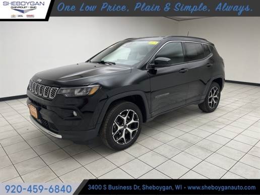 Diamond Black Crystal Pearlcoat 2025 Jeep Compass Limited One Owner, Accident Free History, Leather Seats, Heated Seats, 4WD, 10.1 Touchscreen Display, 4-Wheel Disc Brakes, ABS brakes, Apple CarPlay/Android Auto, Auto High-beam Headlights, Auto-dimming Rear-View mirror, Automatic temperature control, Electronic Stability Control, Front Bucket Seats, Front dual zone A/C, Front fog lights, Fully automatic headlights, Heated door mirrors, Heated front seats, Leather steering wheel, Outside temperature display, ParkView Rear Back-Up Camera, Power door mirrors, Premium audio system: UConnect 5, Quick Order Package 29G, Radio: Uconnect 5 w/10.1 Display, Rain sensing wipers, Remote keyless entry, Security system, Speed control, Split folding rear seat, Steering wheel mounted audio controls, Telescoping steering wheel, Tilt steering wheel, Trip computer, Turn signal indicator mirrors, Wheels: 18 x 7 Painted Diamond Cut Alum (DISC). Odometer is 7520 miles below market average! 24/32 City/Highway MPG At Sheboygan Auto, we walk it, with pride! Our Sales personnel are non-commissioned, which means we pay their wages, not you! If you are looking for a GMC, Chevrolet, or Cadillac we`re a short drive away in Sheboygan. We are located on S. Business Drive, in the South part of town in Sheboygan, Wisconsin. We have a huge selection of GM vehicles for you to choose from. Our dealership is open 6 days a week, as well as our parts and service departments. Check out our hours and directions page, then make the drive to Sheboygan Chevrolet GMC Cadillac. You`ll see why our Cadillac, Chevrolet, and GMC customers keep coming back to our dealership.